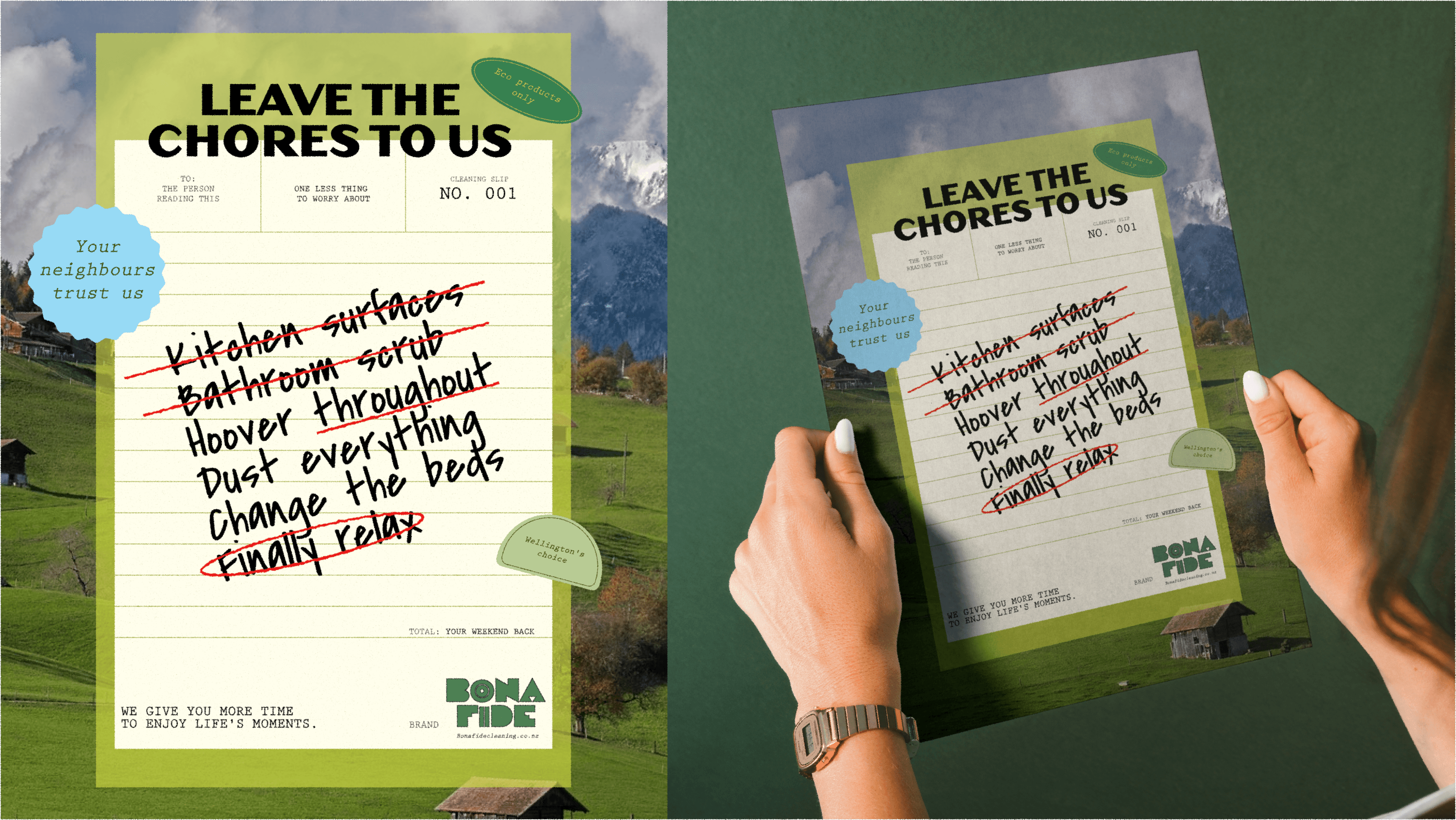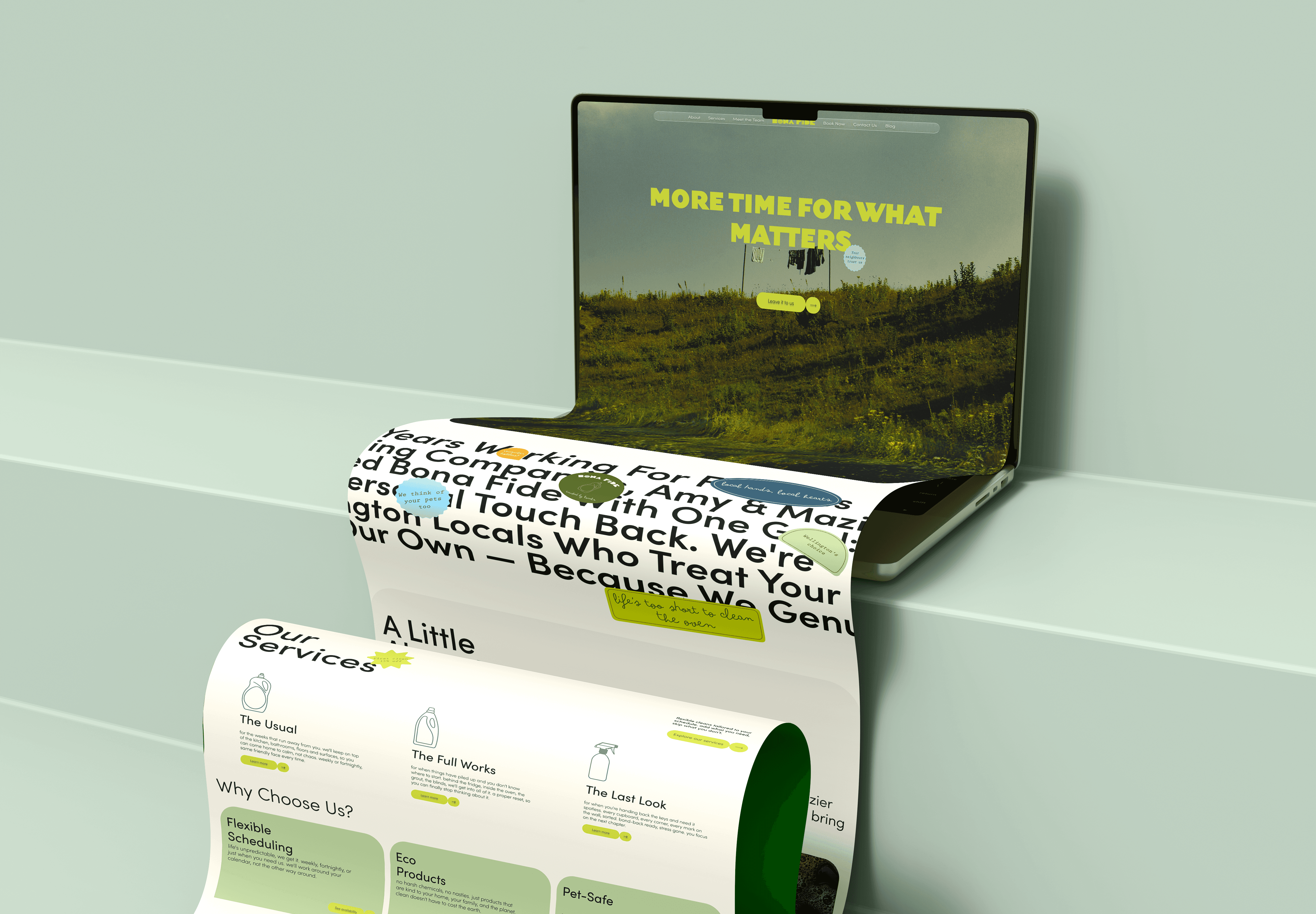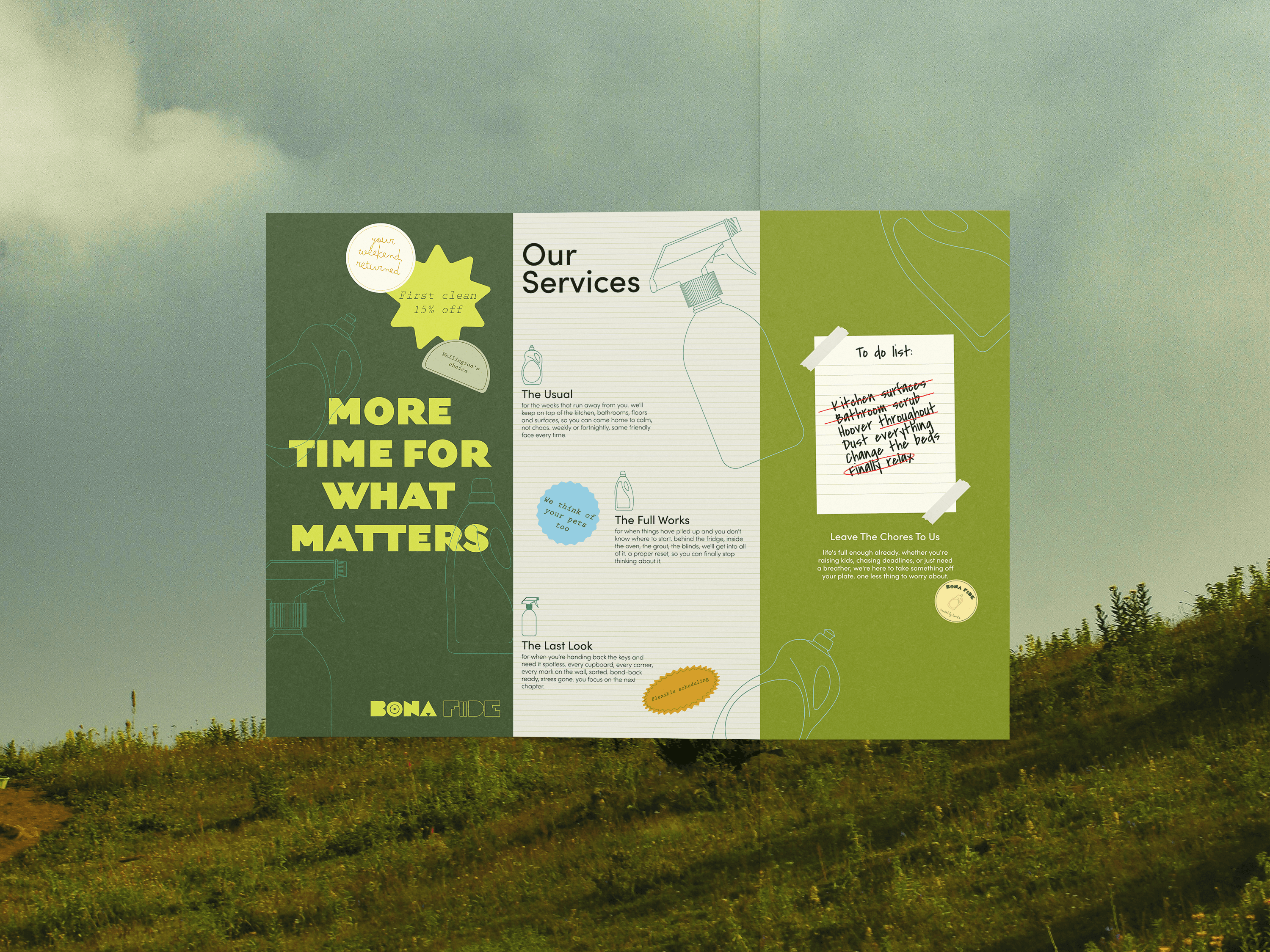 Bona Fide feels warm and trustworthy, like handing keys to a neighbour. Hand-drawn elements, organic textures, and earthy colours create a handmade aesthetic. The conversational tone offers relief without sales pressure—positioning cleaning as self-care, not failure.